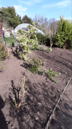 We cleared the border. We left a few of larger shrubs and the hellebores which were flowering at the time otherwise we were had clear ground. The plants we thought could go back, and were clear of ground elder, were planted in borders in front of polytunnel until we were ready to put them back. We then had the fun of planting up the annuals. With help of some medical students who came down as part of their course to learn about theraputic use of garden and nature, we planted lots of seedlings from the polytunnel including sunflowers, cosmos, nasturtiums and sweetpeas. There were also some seeds planted directly into border. Willow supports were made and the border was ready for its first year.
