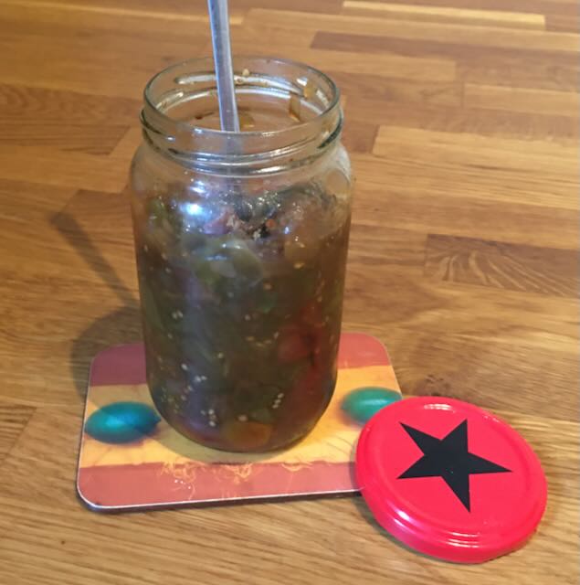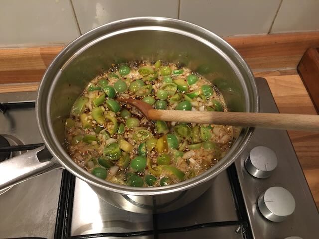 When I was last up at the Garden I tidied up some of the tomato plants and picked almost a kilo of mostly green and a handful or two of tiny ripe fruits. I used them to make this easy and very tasty chutney. As the green tomatoes haven’t developed their natural sweetness, the addition of sugar and raisins improves the tangy flavour. Any ripe tomatoes go in about half way through the cooking time. I also threw in a couple of tomatillos from the poly tunnel. This chutney is delicious with cheese, crackers, and as an addition to meat or veg stews, and a great way to use up your unripe crop before winter really sets in.