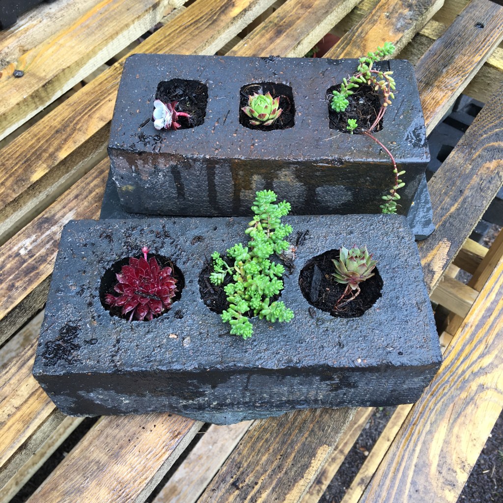These are outdoor succulents, you could do the same for indoor, less hardy, succulents, just make sure you have a tray to put it on in case water or soil leaks out the bottom of the brick holes.
