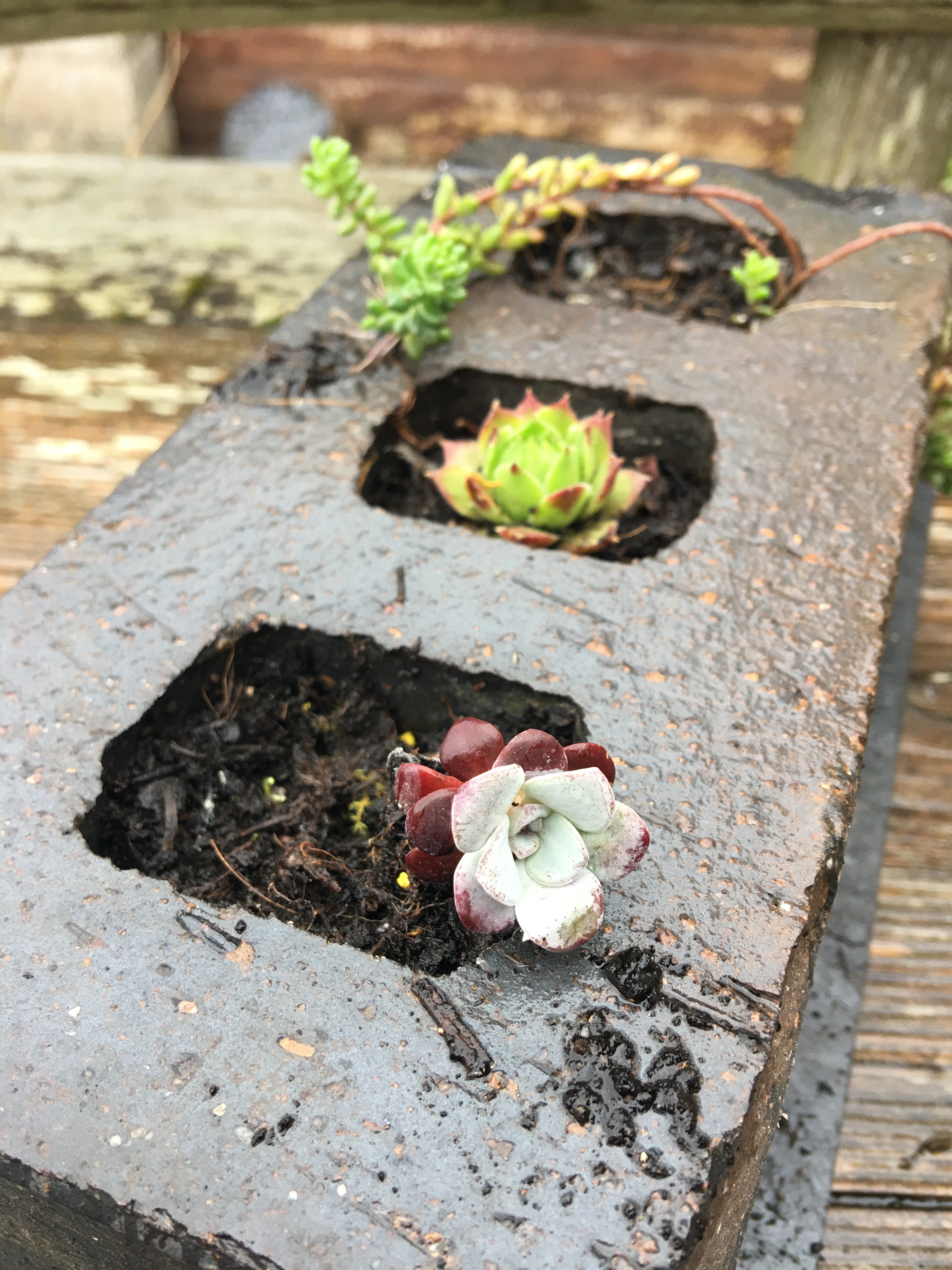 These are outdoor succulents, you could do the same for indoor, less hardy, succulents, just make sure you have a tray to put it on in case water or soil leaks out the bottom of the brick holes.